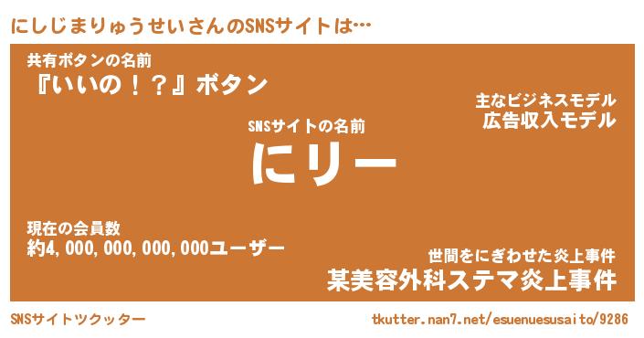 | ポケモン風あだ名 | 『ニシチュウ』『ニシジダネ』 |