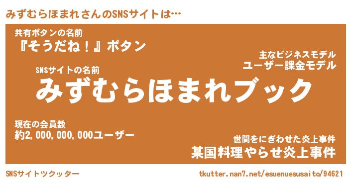 | 男性向けラノベタイトル風あだ名 | 『ミズムラホマレアートオンライン』 |