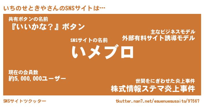 | 肩書あだ名 | 『いちのせときや社長』 |
