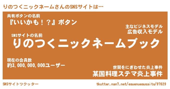 | 病院 | りのつくニックネーム院長の病院名『医療法人黒光りクリニック』 |