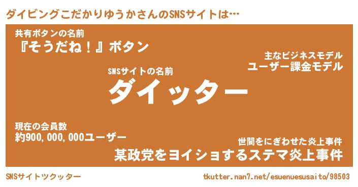 | 男性向けラノベタイトル風あだ名 | 『ダイビングコダカリユウカアートオンライン』 |