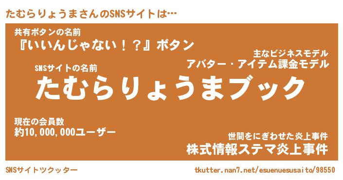 | 女子向けラノベタイトル風あだ名 | 『誰かこのたむらりょうまを説明してください! ~契約から始まるウェディング~』 |