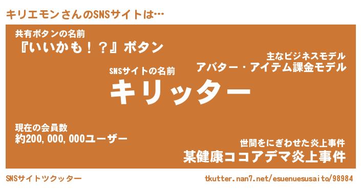 | 胡散臭い通販商品みたいなあだ名 | 『億万長者になれる水晶球…その名も「キリエモン」』 |
