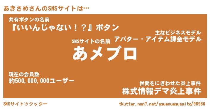 | 意味不明あだ名 | 『ペロリンあきさめ』『永久保存あきさめ』 |