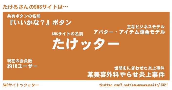 | 男性向けラノベタイトル風あだ名 | 『タケルアートオンライン』 |