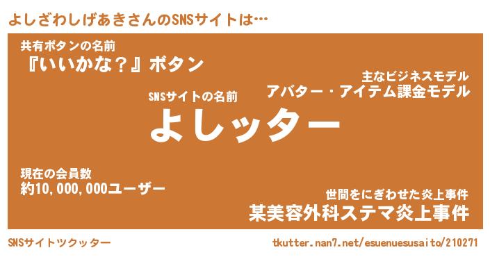 | 肩書あだ名 | 『よしざわしげあきCEO』 |