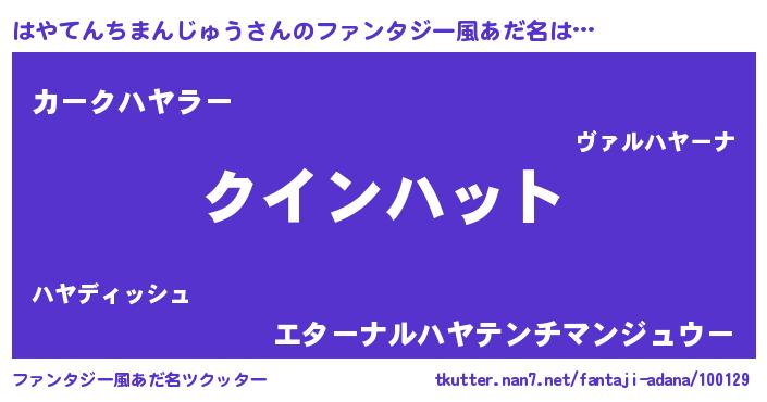 | 男性向けラノベタイトル風あだ名 | 『おまえをオタクにしてやるから、俺をはやてんちまんじゅうにしてくれ! 』 |
