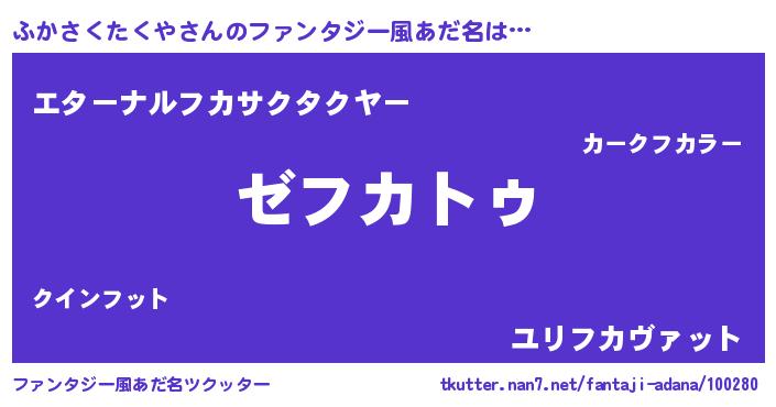| 男性向けラノベタイトル風あだ名 | 『Re:ふかさくたくやから始める異世界生活』 |