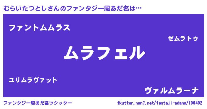| 男性向けラノベタイトル風あだ名 | 『ムライタツトシアートオンライン』 |