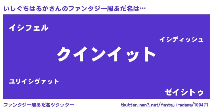 | 男性向けラノベタイトル風あだ名 | 『おまえをオタクにしてやるから、俺をいしぐちはるかにしてくれ! 』 |