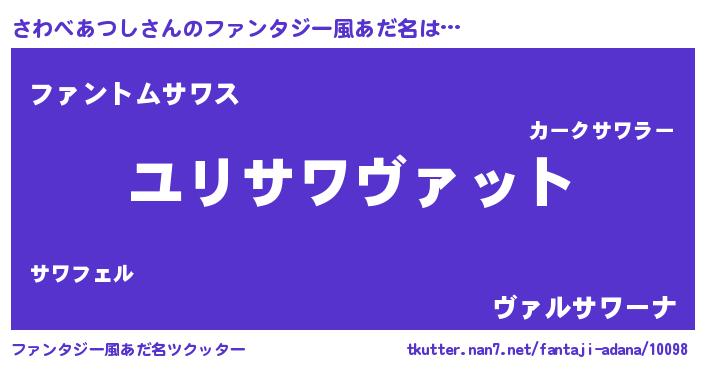 | 男性向けラノベタイトル風あだ名 | 『さわべあつし~年齢イコール彼女いない歴の魔法使い~』 |