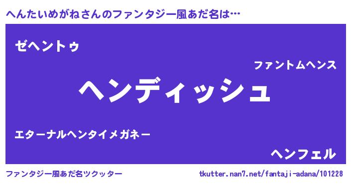 | 男性向けラノベタイトル風あだ名 | 『へんたいめがねという概念が存在しない退屈な世界 』 |
