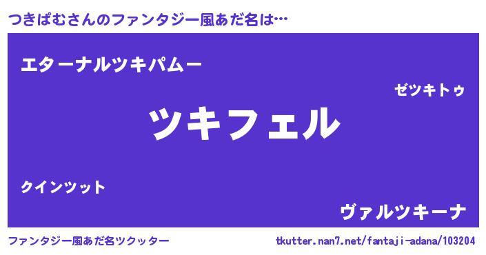 | 男性向けラノベタイトル風あだ名 | 『つきぱむの憂鬱』『魔弾の王とつきぱむ』 |