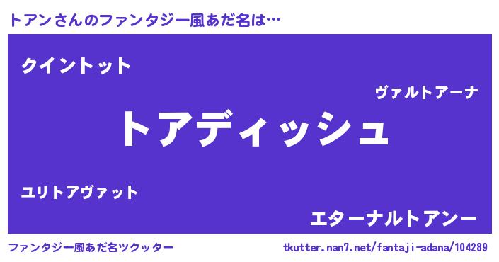 | 女子向けラノベタイトル風あだ名 | 『トアンの契約王妃』『トアン恋絵巻』 |