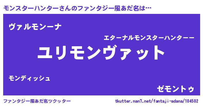 | 男性向けラノベタイトル風あだ名 | 『転生したらモンスターハンターだった件』 |