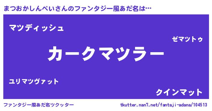 | 男性向けラノベタイトル風あだ名 | 『うちのまつおかしんぺいが世界を掌握している!』 |