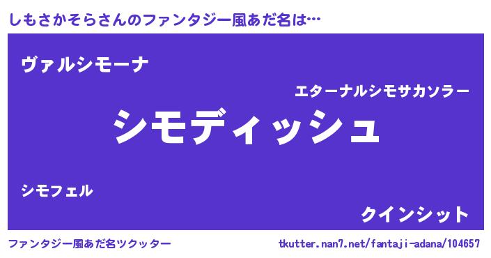 | 男性向けラノベタイトル風あだ名 | 『しもさかそらという概念が存在しない退屈な世界 』 |