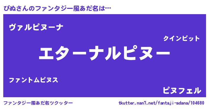 | 男性向けラノベタイトル風あだ名 | 『ぴぬに滅ぼされるだけの簡単なお仕事です』 |
