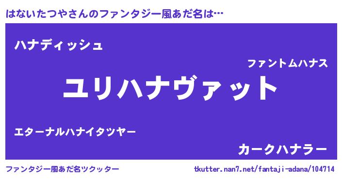 | 男性向けラノベタイトル風あだ名 | 『はないたつや~年齢イコール彼女いない歴の魔法使い~』 |
