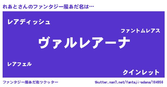 | 男性向けラノベタイトル風あだ名 | 『この素晴らしい世界にれあとを!』 |