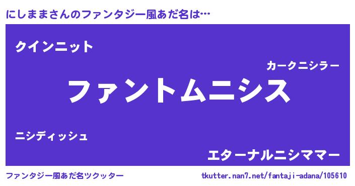 | 男性向けラノベタイトル風あだ名 | 『にしままの嫁は女の子じゃないと思った?』 |