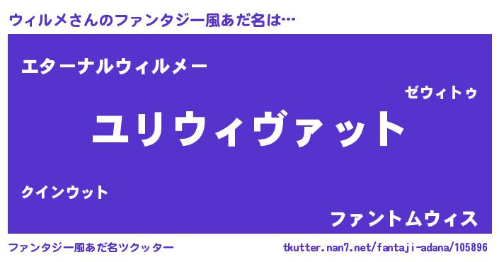 | 男性向けラノベタイトル風あだ名 | 『ウィルメ~年齢イコール彼女いない歴の魔法使い~』 |