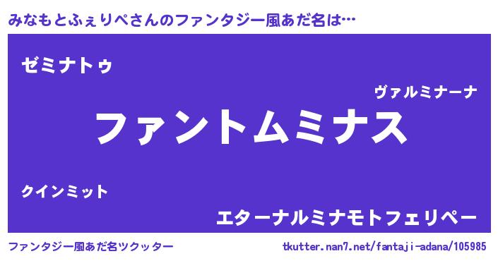 | 男性向けラノベタイトル風あだ名 | 『ダンジョンにみなもとふぇりぺを求めるのは間違っているだろうか』 |