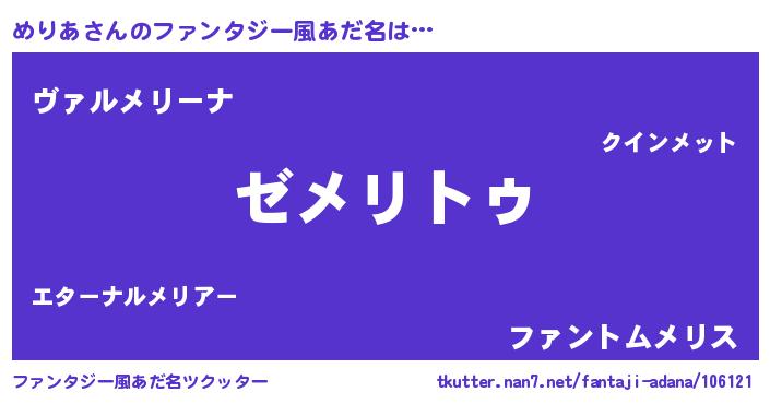 | 男性向けラノベタイトル風あだ名 | 『Re:めりあから始める異世界生活』 |