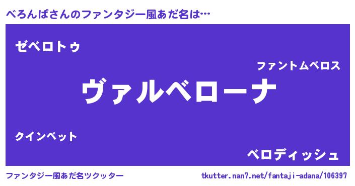 | 男性向けラノベタイトル風あだ名 | 『魔弾の王とべろんぱ』 |