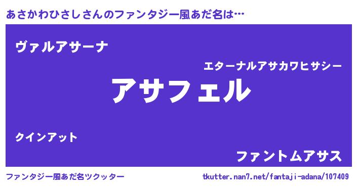 | 男性向けラノベタイトル風あだ名 | 『あさかわひさしに滅ぼされるだけの簡単なお仕事です』 |