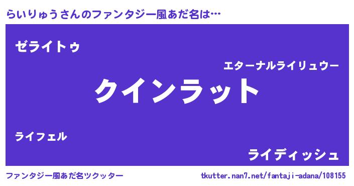 | 男性向けラノベタイトル風あだ名 | 『おまえをオタクにしてやるから、俺をらいりゅうにしてくれ! 』 |