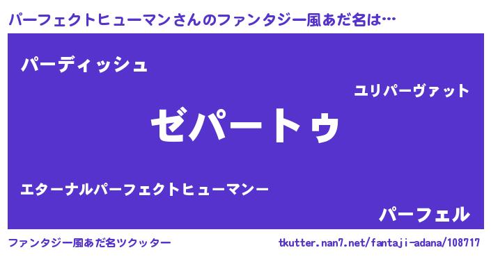 | 男性向けラノベタイトル風あだ名 | 『Re:パーフェクトヒューマンから始める異世界生活』 |