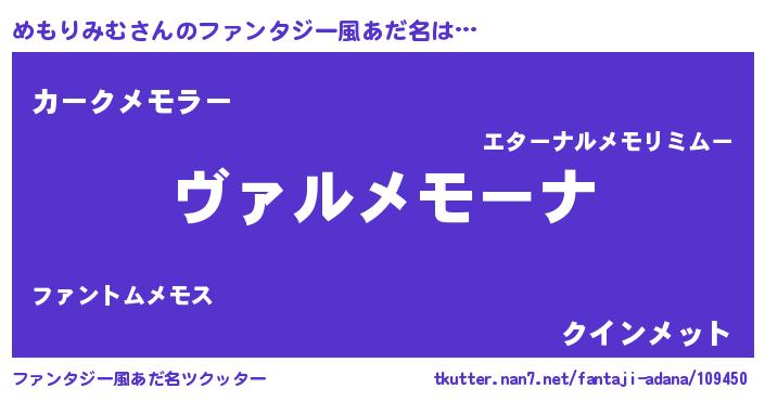 | 男性向けラノベタイトル風あだ名 | 『魔弾の王とめもりみむ』 |