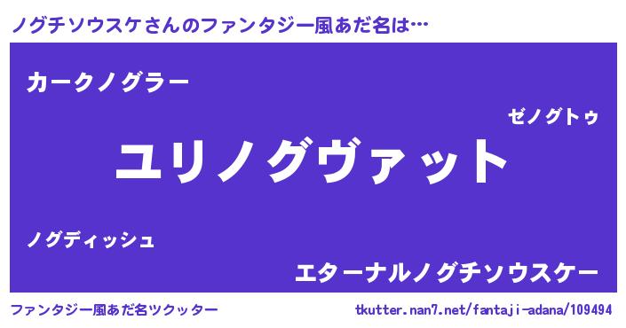 | 男性向けラノベタイトル風あだ名 | 『ノグチソウスケ~年齢イコール彼女いない歴の魔法使い~』 |