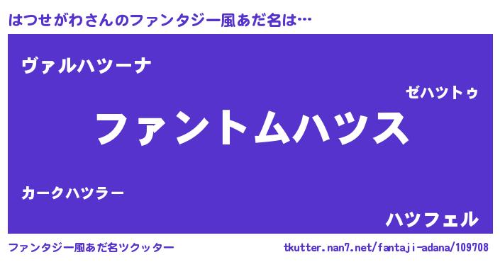 | 男性向けラノベタイトル風あだ名 | 『はつせがわの嫁は女の子じゃないと思った?』 |