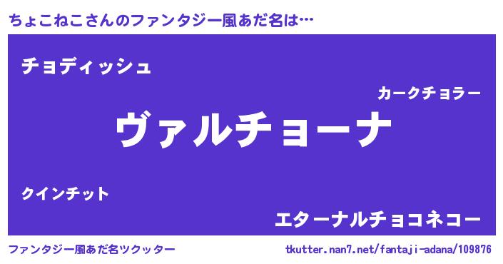 | 男性向けラノベタイトル風あだ名 | 『この素晴らしい世界にちょこねこを!』 |