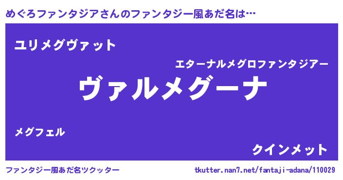 | 男性向けラノベタイトル風あだ名 | 『この素晴らしい世界にめぐろファンタジアを!』 |