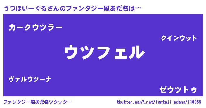 | 男性向けラノベタイトル風あだ名 | 『うつほいーぐるに滅ぼされるだけの簡単なお仕事です』 |