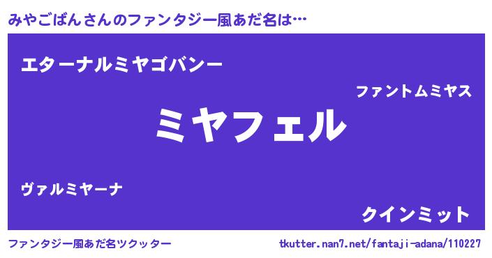 | 男性向けラノベタイトル風あだ名 | 『ミヤゴバンアートオンライン』 |