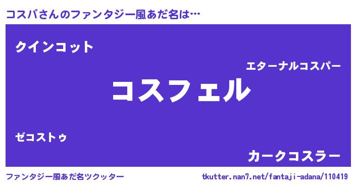 | 男性向けラノベタイトル風あだ名 | 『コスパの憂鬱』『緋弾のコスパ』 |