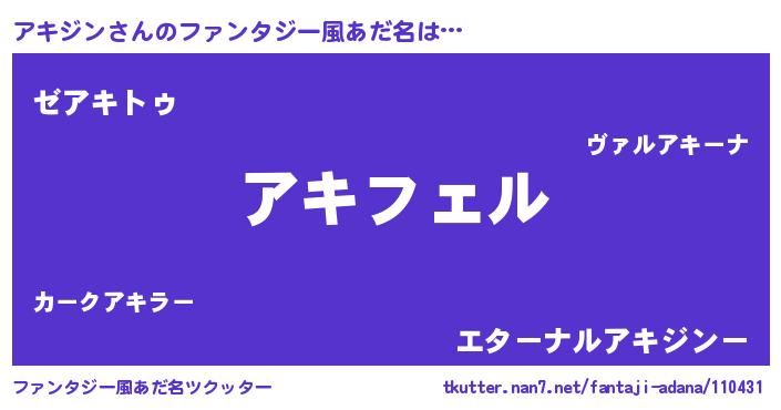 | 男性向けラノベタイトル風あだ名 | 『アキジンの憂鬱』 |