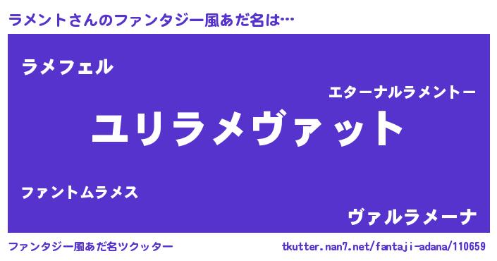 | 男性向けラノベタイトル風あだ名 | 『転生したらラメントだった件』 |