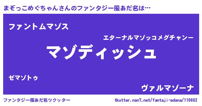 | 男性向けラノベタイトル風あだ名 | 『まぞっこめぐちゃんという概念が存在しない退屈な世界 』 |