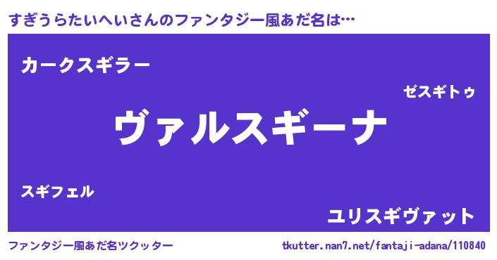 | 男性向けラノベタイトル風あだ名 | 『魔弾の王とすぎうらたいへい』 |