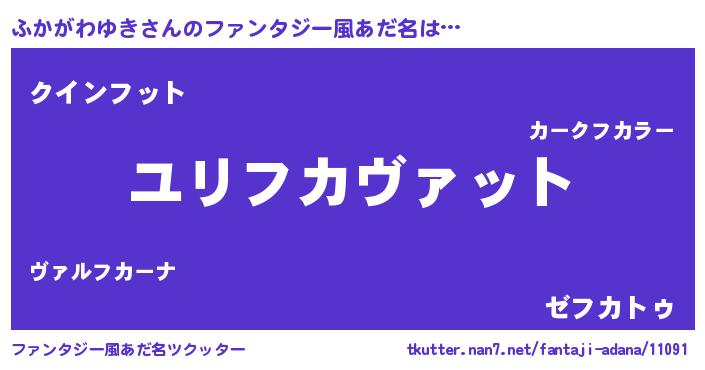| 男性向けラノベタイトル風あだ名 | 『ふかがわゆき~年齢イコール彼女いない歴の魔法使い~』 |