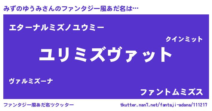 | 男性向けラノベタイトル風あだ名 | 『みずのゆうみ~年齢イコール彼女いない歴の魔法使い~』 |