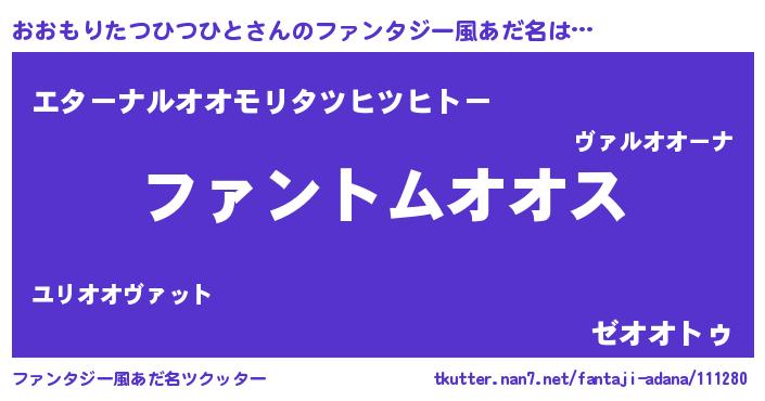 | 女子向けラノベタイトル風あだ名 | 『おおもりたつひつひとの卵を拾いまして』 |