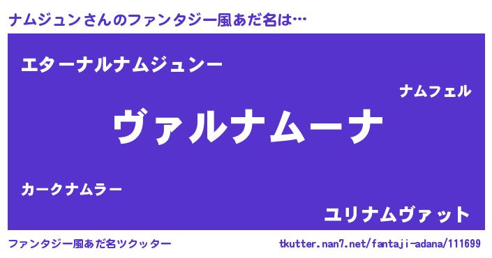 | 男性向けラノベタイトル風あだ名 | 『魔弾の王とナムジュン』 |