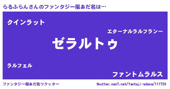 | 意味不明あだ名 | 『自称らるふらん』『ペロリンらるふらん』 |