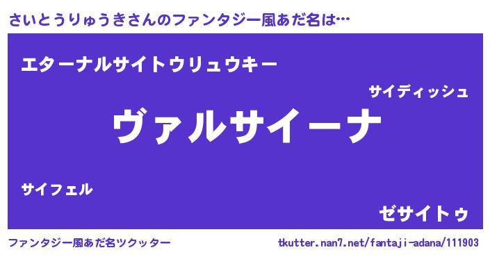 | 意味不明あだ名 | 『住所不定無職さいとうりゅうき(89歳)』 |